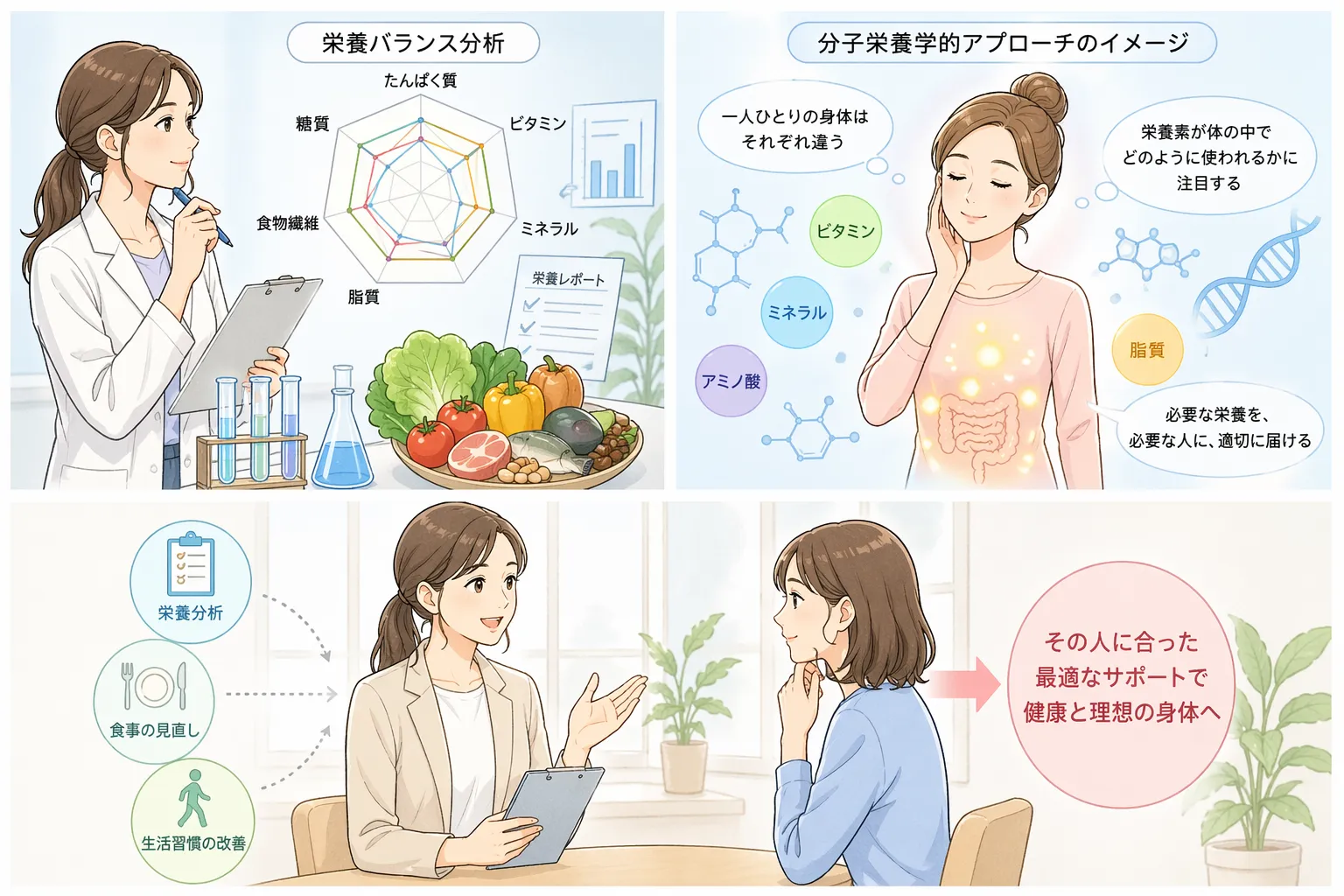 分子栄養学的アプローチは、こうした“身体の中の使われ方”まで視野に入れて考える方法です。